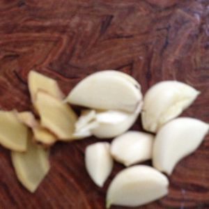 4.再倒入电饭煲里,加入开水后撒入蒜瓣(开水不要太多,肉量的三分之二即可) 煮上约半个小时后,尝尝是否软糯 如果未达到效果,最后再放入盐 再焖十分即可