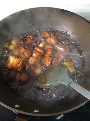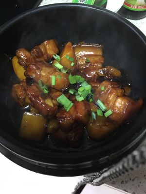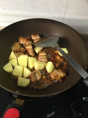 3.喷入黄酒,锅盖盖起,然后过几秒打开,倒入老抽和生抽(老抽我用六月鲜,生抽我用薄盐生抽)老抽少一点。生抽多一点。 4.此时可以加入土豆了(也可以加自己喜欢的)此时加入足量的黄酒。没过肉,盖盖炖煮,大火烧开后。烧5分钟。转小火。煮。按个人口味。喜欢