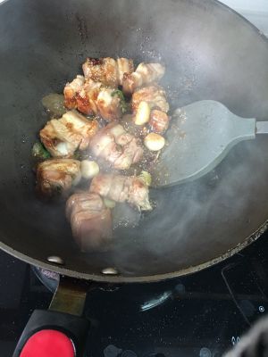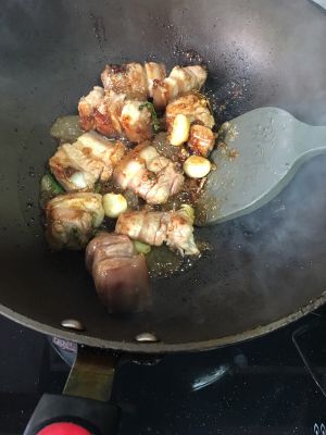 蒜头加入后炒至蒜香味出来,加入白糖,酱油,料酒,继续翻炒约两三分钟