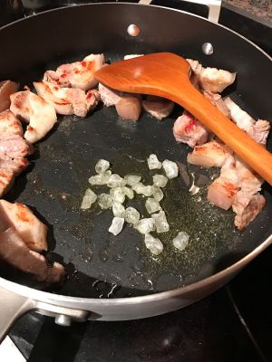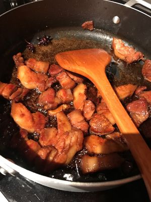 2.待油香味飘出。冰糖稍微融化,放入五花肉(五花肉可以抄一下水),直至五花肉上色。
