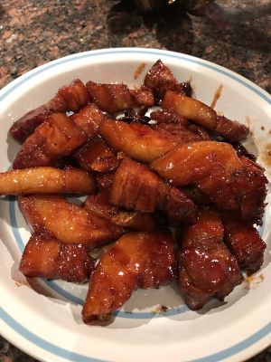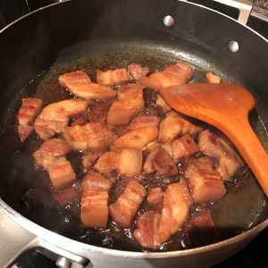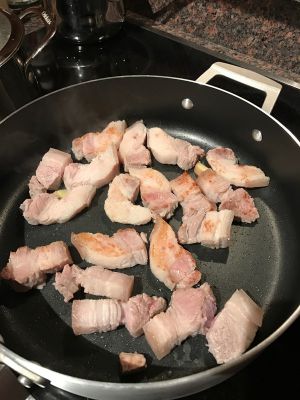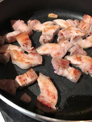 煮好后洗净;切成2厘米左右的块状; 热锅(不加油)直接将五花肉放入转中-中大火慢慢煎出油