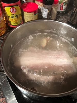 加入姜片和料酒。五花肉祛血水(水开后煮5-10分钟)