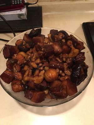 做的有点多,只能用盆装了。用电磁炉老怕干锅用铲子翻了几次,所以栗子不完整。提示一下调好味后尽量不要去翻炒这样栗子就完整了!