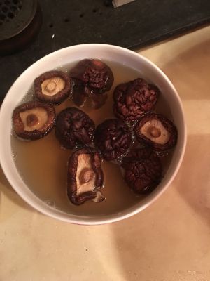 泡香菇 记得要用开水找个盖闷着。差不多10分钟左右吧。泡完的水别倒可以当高汤待会儿放锅里。