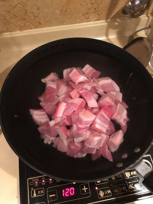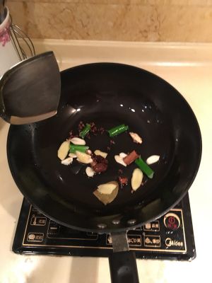 放油把之前准备调料下锅,炒出香味后下肉。因为是电磁炉受热不均匀没敢炒糖色。