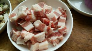 精五花一份要选一层肥一层瘦的分层越多越好(这次买了一斤半,四个人吃到舔盘)五花肉洗净,切成四大块,锅内烧热水,水开后放入五花肉块,焯水10分钟用筷子可以扎透。捞出洗净浮沫,改刀切小方块
