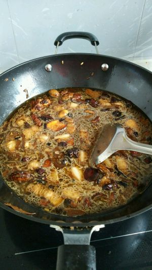 全部上色后加入葱、姜、红辣椒、香叶、八角、桂皮、白芷。有葱花香味后倒料酒和生抽。