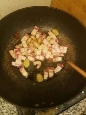锅里加少许油,倒入沥干水的五花肉,放入葱姜,大料,小火煸炒!炒至肉四周都变成焦黄色,关火,把里面的油倒出!备用,