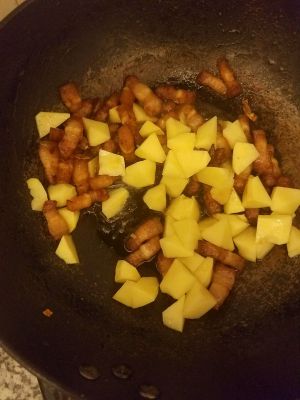 锅里不放油,把煮好的五花肉单独盛出来倒入锅内,开中小火不停翻动,直到油脂溢出