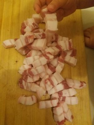 五花肉凉水下锅,放两片生姜,把大葱叶子放进去,一勺料酒!水烧开后,舀去浮沫,煮两分钟捞出备用!