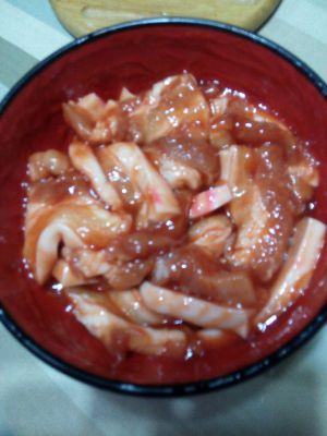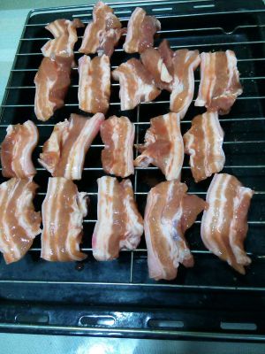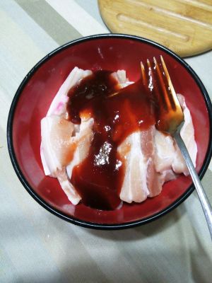 五花肉泡水半小时,切片,用叉子叉点小孔,加入一勺叉烧酱。