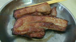 将腌好的五花肉洗净、用厨房专用纸擦干水份,放入滚油慢煎或慢炸约八~~~~~十分钟