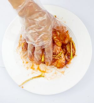 制腌料汁 将50ml叉烧酱,15ml蚝油,2g糖,2g胡椒粉,1g盐倒入碗中搅拌均匀,即制成腌料汁。