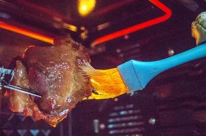 入箱烤制 将肉串入烤叉中,放入预热好的烤箱中层,烤制60分钟。(时间可根据肉的大小进行调整)每隔20分钟需刷一次腌料汁和蜂蜜。