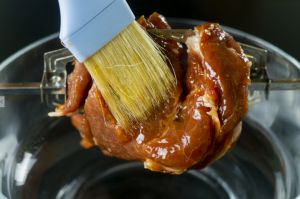 刷上酱汁 烤架上铺一层锡纸,取出腌制好的肉,两面分别均匀的刷上剩余的腌料汁,然后再刷上一层蜂蜜。同时将烤箱调至转叉功能,开启180度预热10分钟。