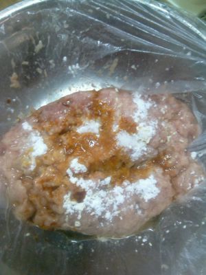 准备好肉馅,加少许花生油,酱油,盐,胡椒粉,淀粉,拌匀,腌制一小时左右。