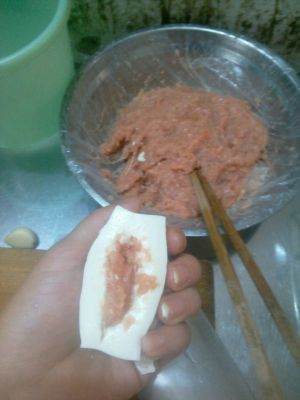 轻轻的把豆腐中间掏掉一点不要,把肉馅塞进去,小心点一定要温柔一点,肉馅要一点一点塞,豆腐才不会破