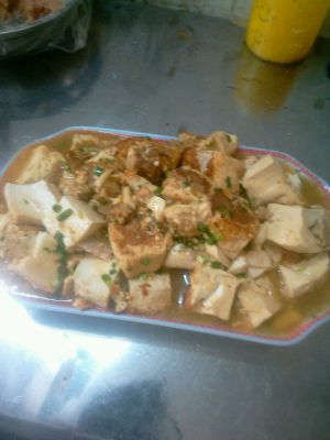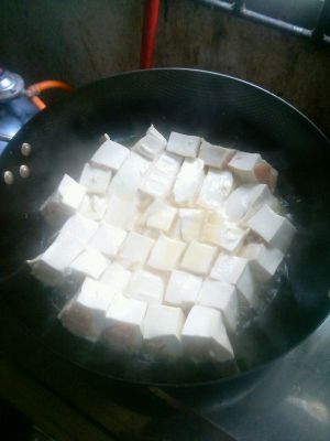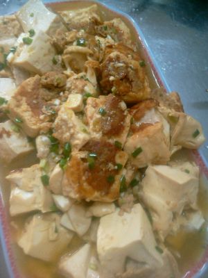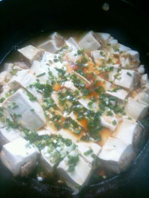 热油放豆腐,煎到表面金黄,放热水跟酱油,盐,发葱花,就可以啦