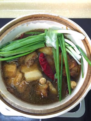 再把肉放进砂锅里,加入小香葱 大火烧开,小火慢煲至水收干,就可以了,估计要30-40分钟,我没注意看时间