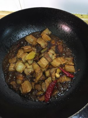 从肉着色后加水开始煮50分钟后,大火开盖收汁。