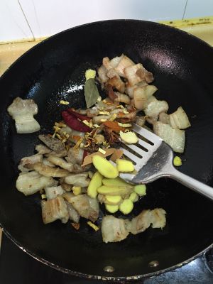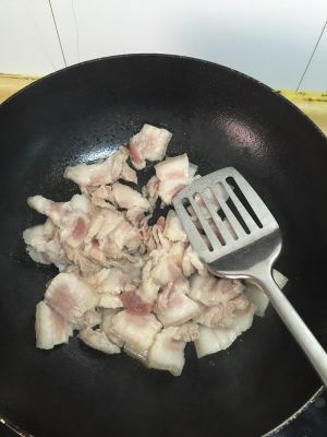 放入红烧肉翻炒至着色。如果冒烟少加点水。