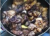 翻炒片刻后加入香菇同炒。加入热水烧开,转入砂锅中。