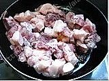 倒入老抽拌匀,下猪肉同炒,此时可以加入姜和蒜。