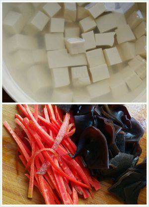 胡萝卜切丝,木耳切块备用;嫩豆腐切成2厘米见方小块,用盐水腌;