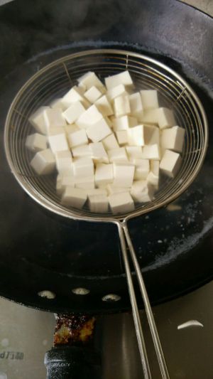 先把豆腐切成2厘米见方的小块,用淡盐水浸泡10分钟(防止一会儿炒碎)