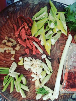 锅内放入少许油,入蒜姜辣椒爆炒,接着放入青椒等配菜