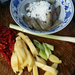 虾;加少量的盐!一定要少量就好。抓匀后,再加入少量淀粉,抓匀。这样放着就好,我们开始继续准备切其他食材。