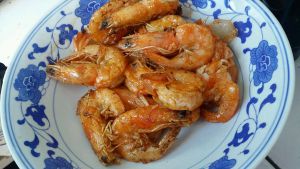 活虾水煮或者是油炸,挑剔一点的就在活虾的时候掰断头直接去虾线。水煮或油炸都要适当的撒盐。