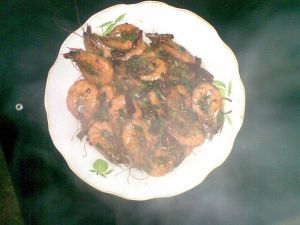 爆炒出香味放入炸好的虾,接着放入料酒,酱油,蚝油,盐少许(可根据自己口味调),继续爆炒片刻即可