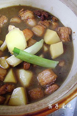 然后准备热的高汤(没有就用清水) ,大料一包(八角,桂皮,香叶等,我用的是现成的炖肉调料包),把炒锅里的肉转至砂锅中,大火烧开,加入一大勺老抽,一勺料酒,然后盖上盖子小火一直炖1个多小时,我是感觉肉有七成熟时放的土豆,时间大约是起锅前20几分钟吧。(检验肉烂的标准,筷子一戳,轻易叉进肉里,说明肉烂了)最后放盐等调料,把汤汁收至粘稠即可。