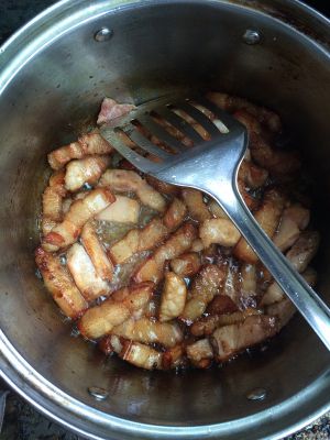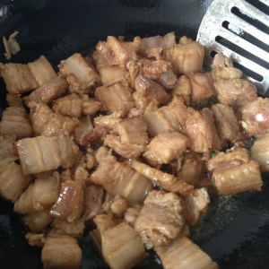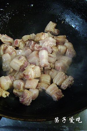 炒锅里放油,2大勺冰糖小火融化,到糖变颜色冒泡泡后,赶快把肉放进去不断翻炒,煸至油都靠出来,这样做出来的肉比较不腻