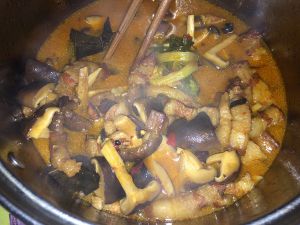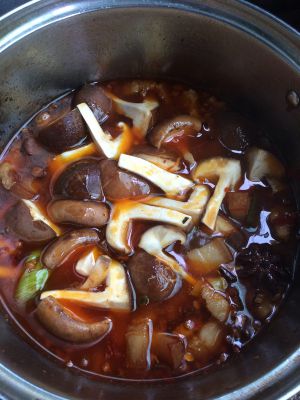 香菇一分为四下锅,然后可以下锅了五十到一个半小时都可以,注意看锅别糊了。当然你喜欢土豆、胡萝卜、莴笋、苦瓜……喜欢什么自己➕➕➕,只是注意不同材料下锅早晚时间不一样,当然还是取决于你喜欢吃的软硬程度。(高压锅的话最好还是香菇下锅了再上锅盖一起烧,时间半小时足够了,而且肉比小锅的烂)。