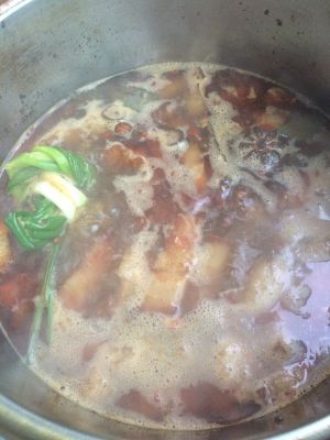 之后把葱卷好,锅里加水大火烧开后转小火慢炖,这时候可以去准备香菇了,我做过干香菇的,觉得味道太重,吃久了牙齿会觉得又厚又涩口感差,次日早上想拌面吃时味是苦的超不好吃。(如果有高压锅水只要刚刚没过肉就好)