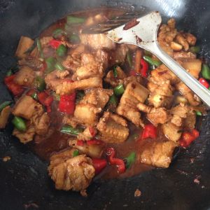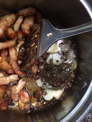 我难得将肉捞起,扒到一边用刚刚煎出来的油炒姜、蒜、花椒、卤料(我买的卤料包一块五毛钱),有香味后再混合肉一起翻炒均匀。