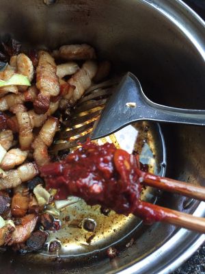 倒入五花肉,放一大勺蚕豆酱、少许老抽、糖,翻炒一下