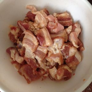 锅中放入适量油,放入五花肉,煎至8分熟后捞出备用。