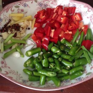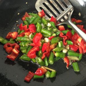 放入指天椒红椒大蒜翻滴入几滴醋翻炒一下