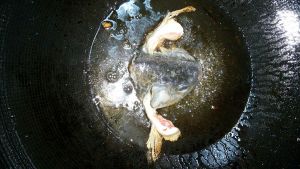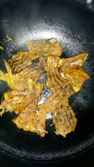 油五成熟放入鱼头炸,关小火,此时注意摆好造型,定型后炸侧面