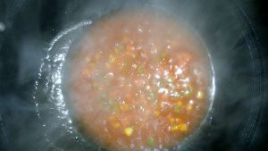 清水煮蔬果粒,调入一勺白醋,水淀粉,煮开,放番茄酱