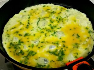 腌渍西葫芦的同时,平底煎锅至火上烧热倒少许油摇匀,倒入蛋液煎成蛋饼;