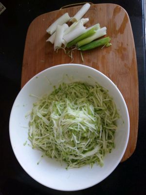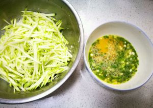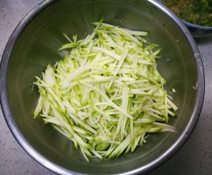 西葫芦擦最细的丝,放盐拌匀,这一步是为了把西葫芦杀出水来,杀出的水不要倒了
