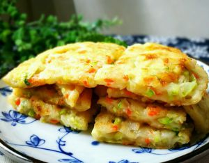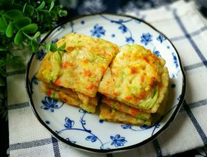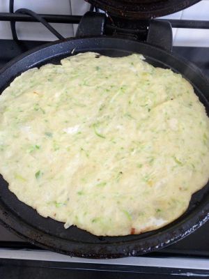 加适量水调成面糊~~所谓适量,是需根据西葫芦的出水量酌情添加,要少量少量慢慢地加水,至面糊能比较顺利摊开成均匀的薄饼即可。水过少面团不易散开会导致软饼厚薄不均;水过多则会使饼过于软烂而影响口感,一点一点逐量添加,多试几次就有经验了。