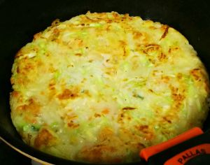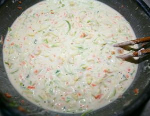 所有材料都和到一起,开摊! 注:做之前可以拿筷子沾一下面糊尝尝咸淡!