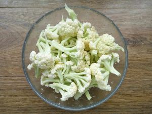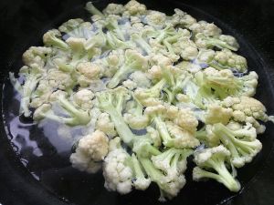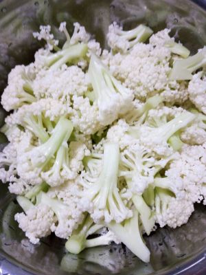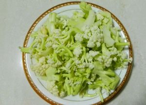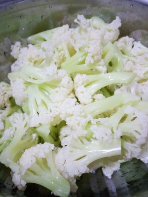 锅上火加水,水中加少许盐。水开后给菜花飞水,焯好水后马上进入凉水过凉待用。