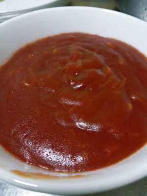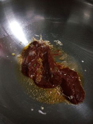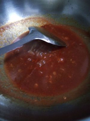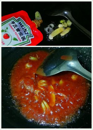 葱香出来后关小火将番茄酱炒出红油,加入白糖继续炒。