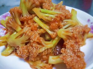 菜花裹满番茄酱,九成熟。撒点香葱。出锅了。
